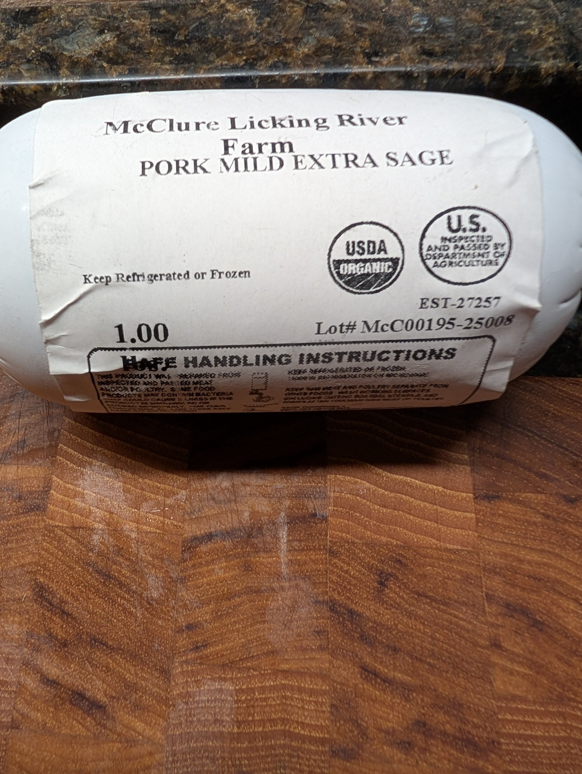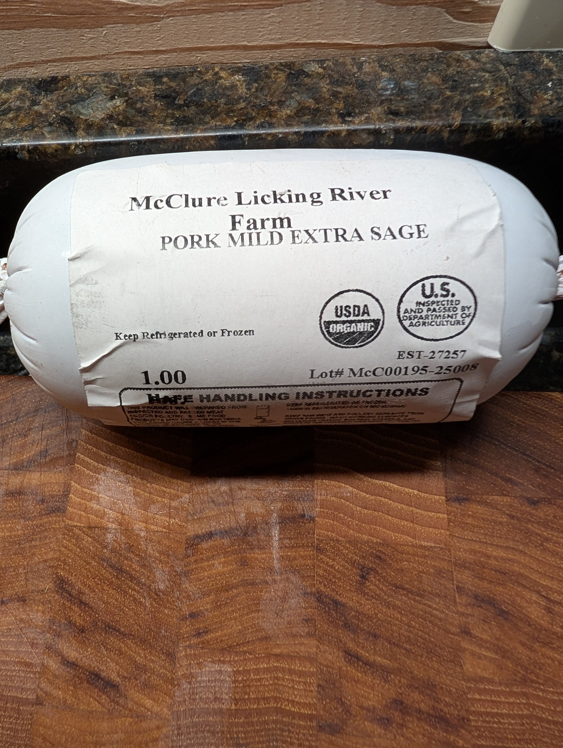 This is a Mangalista Ground Sausage, approximately a one-pound package. It is available in three flavors. Our Pastured Manalastas are given a natural environment to forage for nuts and nutrient-rich forage. We feed them an organic, non-GMO mix of grains and do not give them corn or soy. Available in rolls or packs of 1 pound.