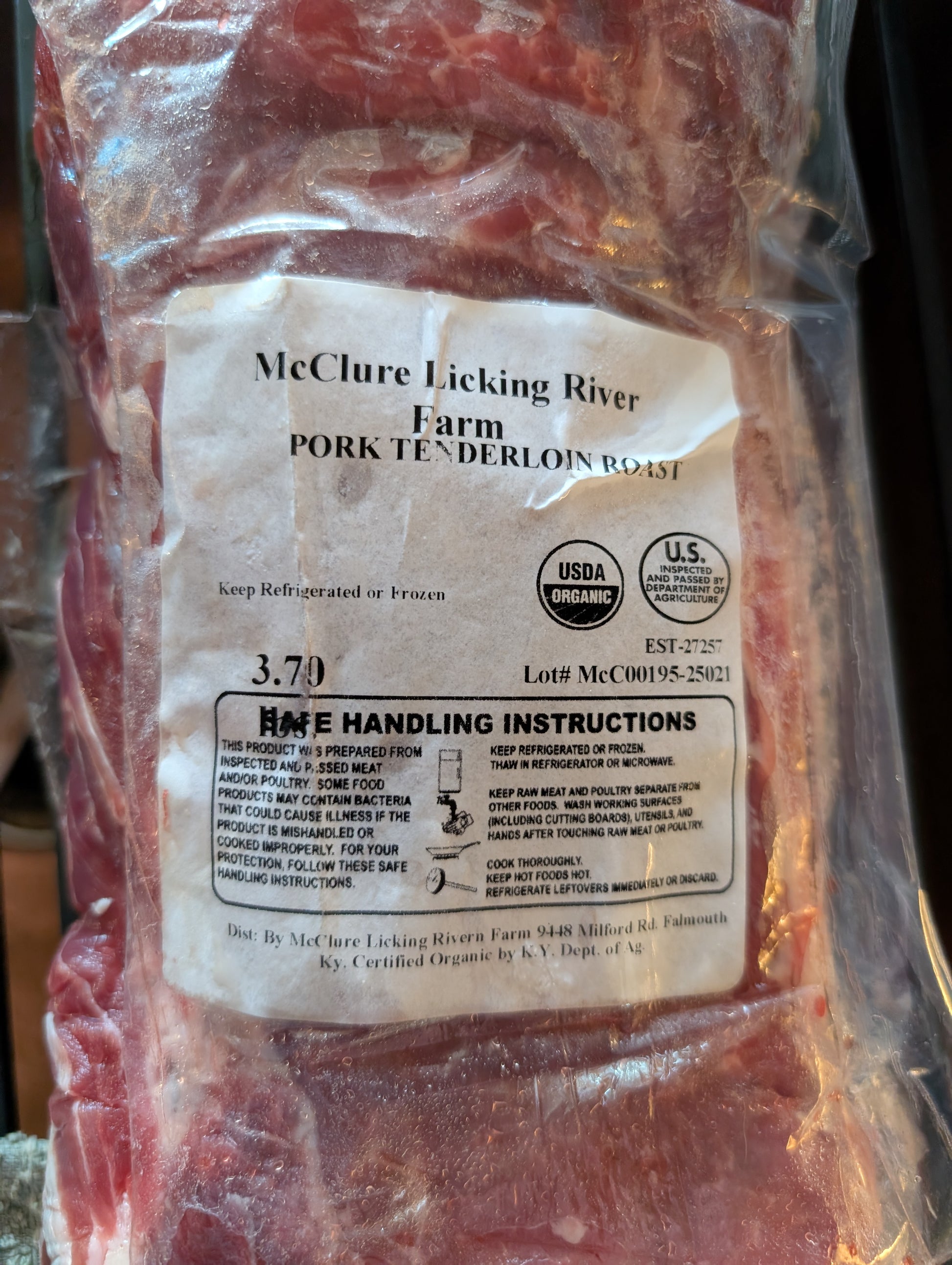 This is a Mangalista Tenderloin Roast 1 per pack. Choose 2.34-2.62 pounds or 2.94-3.48 pounds. Our Pastured Mangalistas are given a natural environment to forage for nuts and nutrient-rich forage. We feed them an organic, non-GMO mix of grains and do not give them corn or soy.