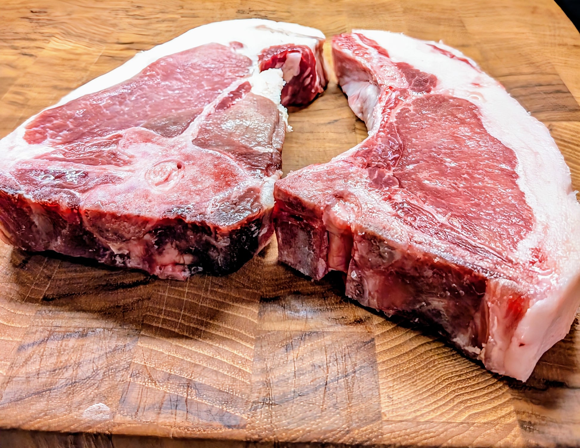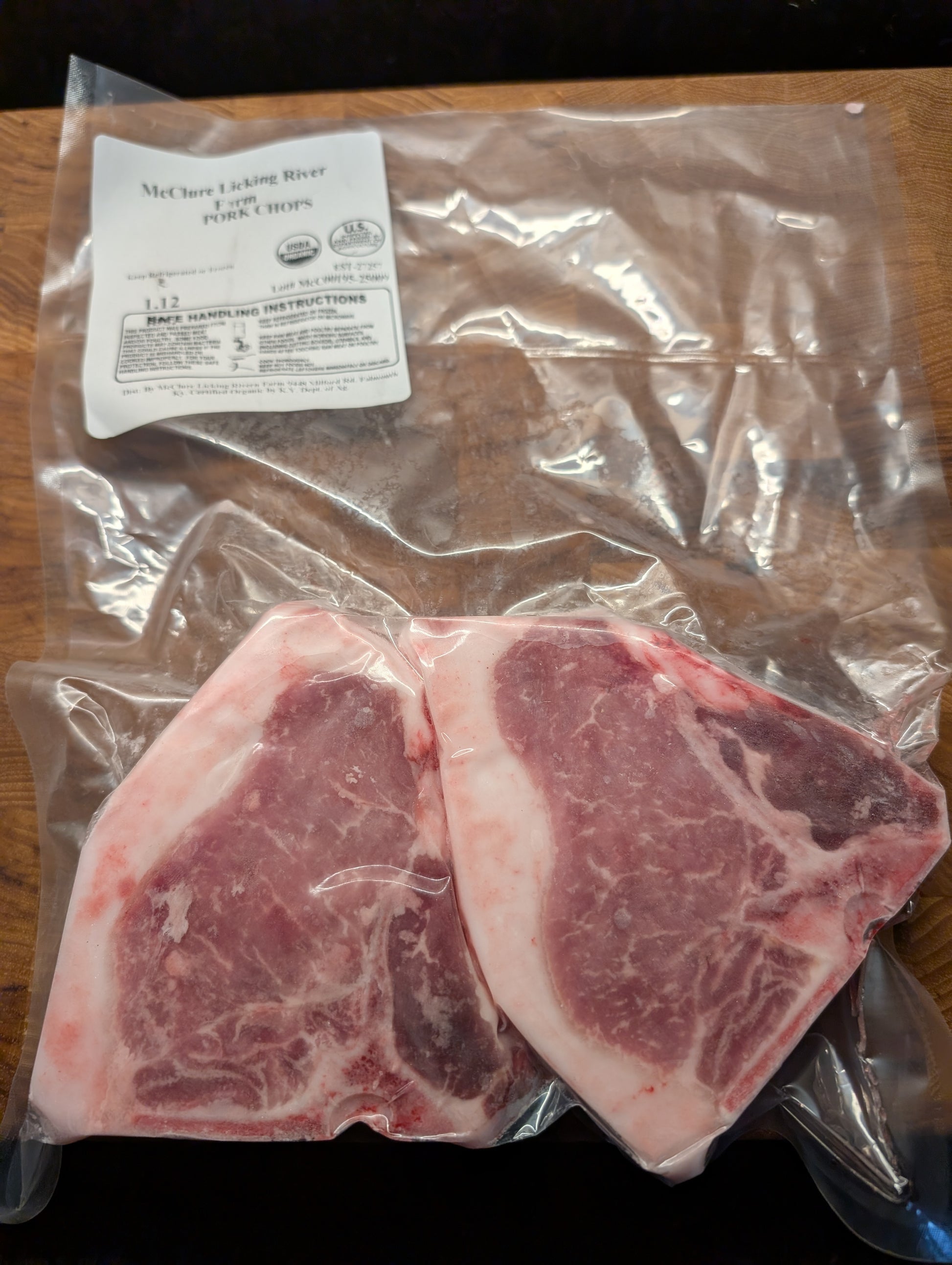 This is a Mangalista porterhouse Chop 1.25" thick pack of 2 chops. This is a perfect combination of the bone in the cut, where the tenderloin and loin chop combine for an amazing flavor. Our Pastured Mangalistas are given a natural environment to forage for nuts and nutrient-rich forage. We feed them an organic, non-GMO mix of grains and do not give them corn or soy.