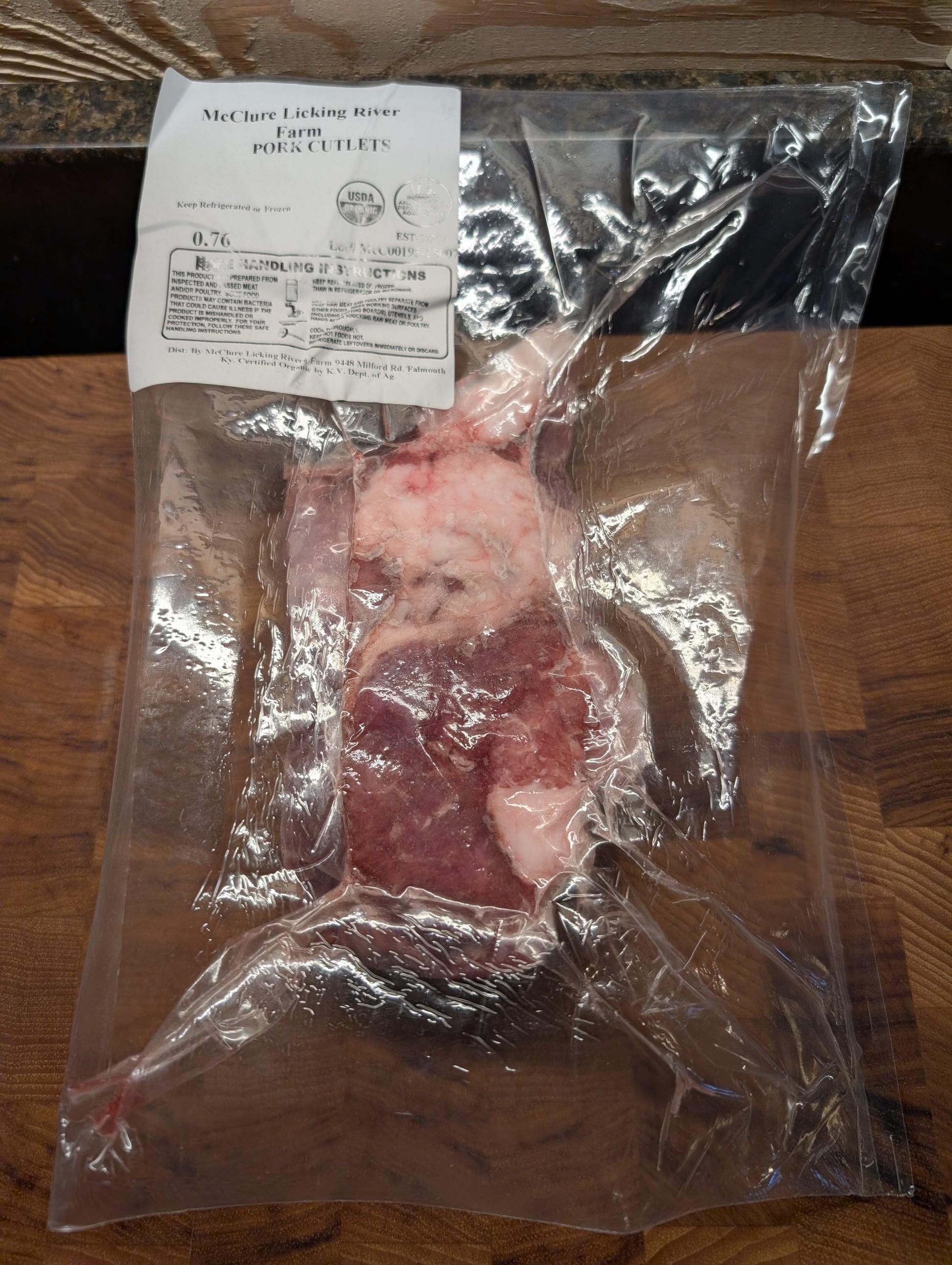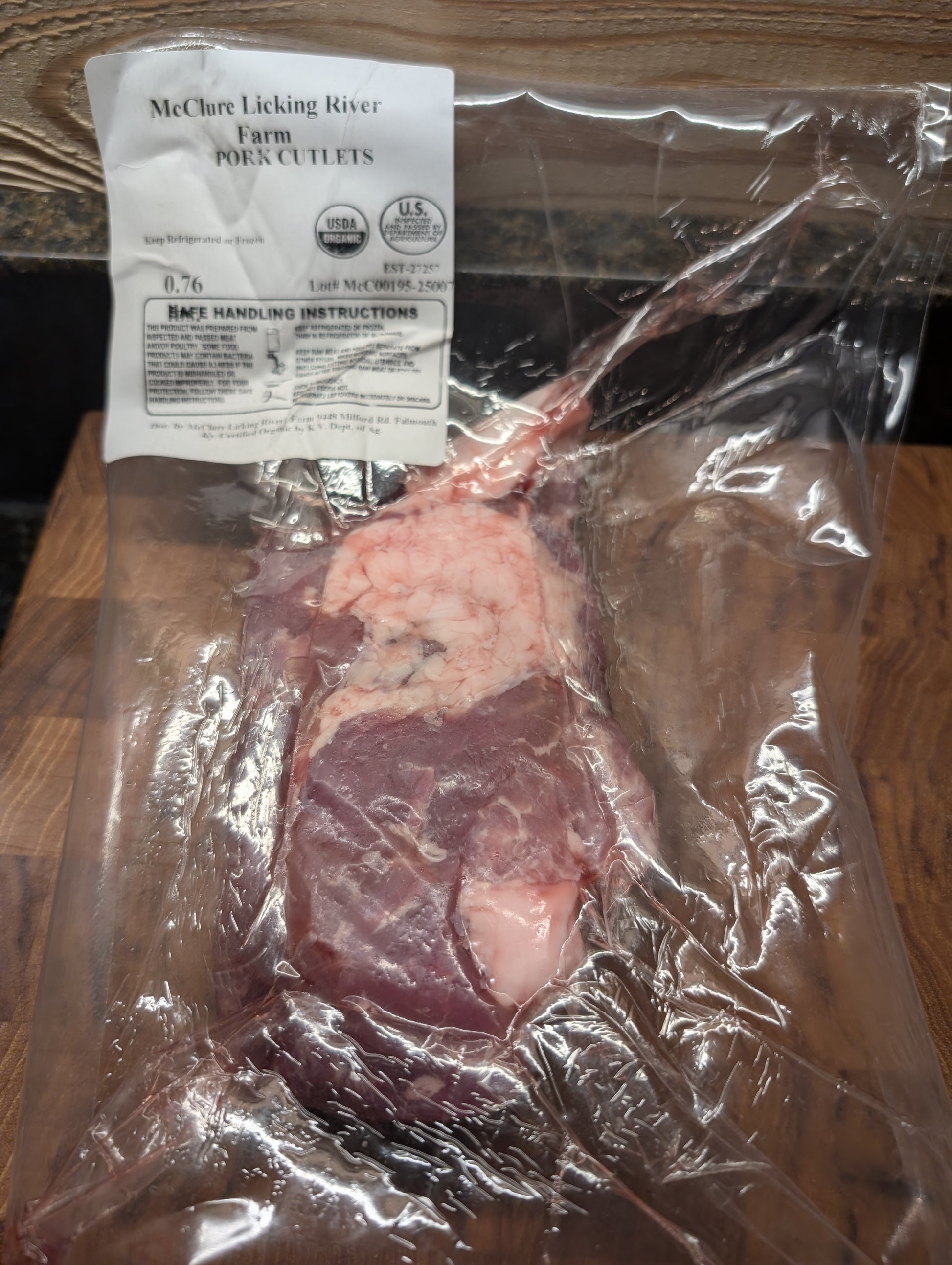 This is a Mangalista Ham shoulder cutlets. This cut is Tenderized from the ham into thin slices, 3 to 4 per pack. We often tell people that if you served our pork and did not tell your guests what meat it was, most would think they were eating a beef steak. Our Pastured Mangalistas are given a natural environment to forage for nuts and nutrient-rich forage. We feed them an organic, non-GMO mix of grains and do not give them corn or soy.